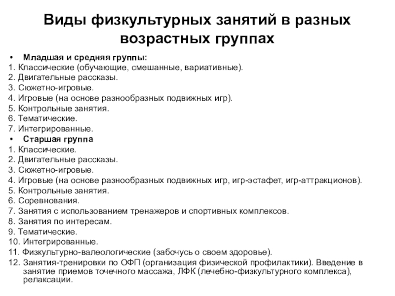 Слайд 12Виды физкультурных занятий в разных возрастных группах