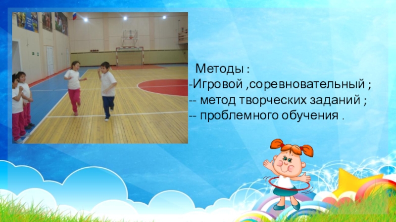Методы :Игровой ,соревновательный ;- метод творческих заданий ;- проблемного обучения .: