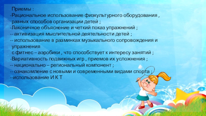 Приемы :Рациональное использование физкультурного оборудования , разных способов организации детей ;Лаконичное объяснение и четкий показ упражнений ;-