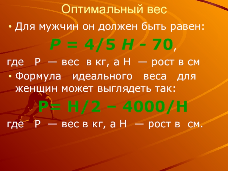 Слайд 18Вес рассчитать можно, используяь индексом Кетле. Согласно этому индексу:
