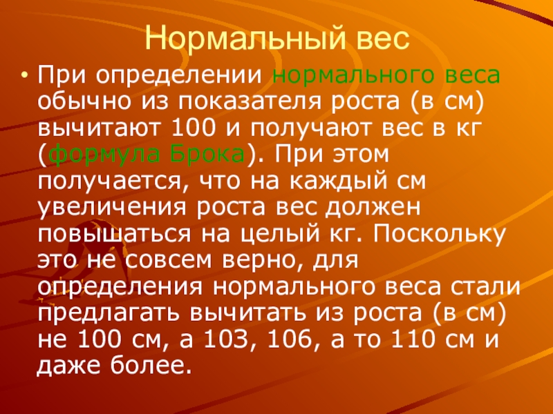 см) вычитают 100 и получают вес в кг (формула Брока). При этом получается, что на каждый см увеличения роста вес должен повышаться на целый кг. Поскольку это не совсем верно, для определения нормального веса стали предлагать вычитать из роста (в см) не 100 см, а 10З, 106, а то 110 см и даже более.
