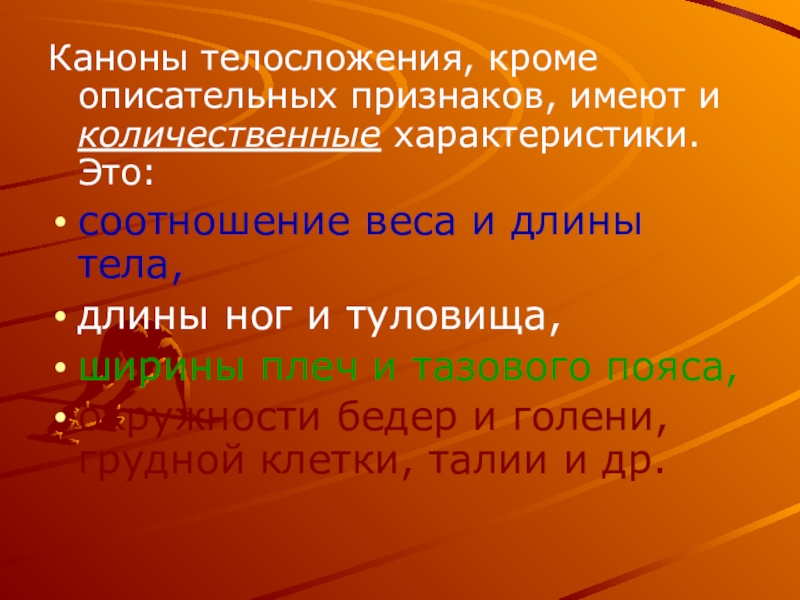 Слайд 3Каноны телосложения, кроме описательных признаков, имеют и количественные характеристики. Это: