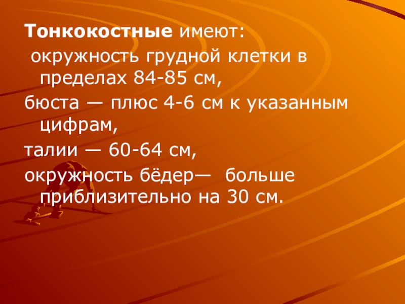 Нормостенический тип телосложения считается, если: окружность грудной клетки — половина роста, плюс 2-5 см; бюст— окружность грудной клетки, плюс 8-10 см;