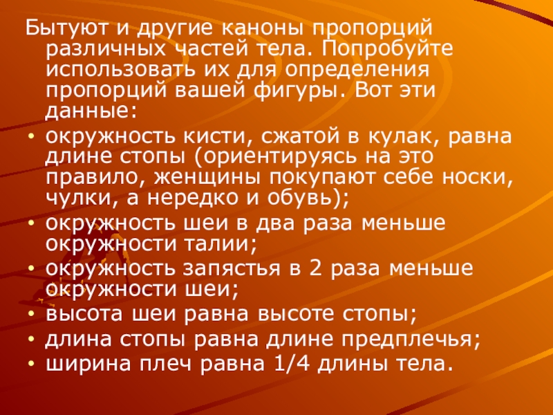 Слайд 8Бытуют и другие каноны пропорций различных частей тела. Попробуйте использовать их