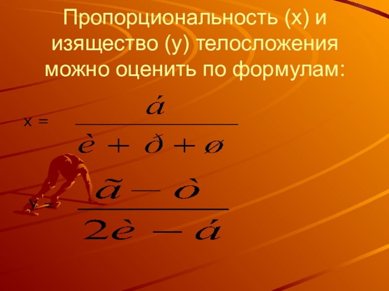 Слайд 14Пропорциональность (х) и изящество (у) телосложения можно оценить по формулам: