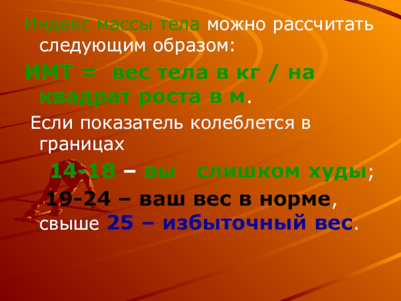 Слайд 19Индекс массы тела можно рассчитать следующим образом: