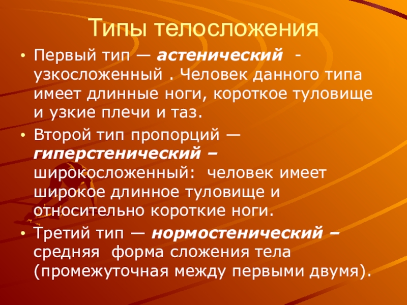 Первый тип — астенический -узкосложенный . Человек данного типа имеет