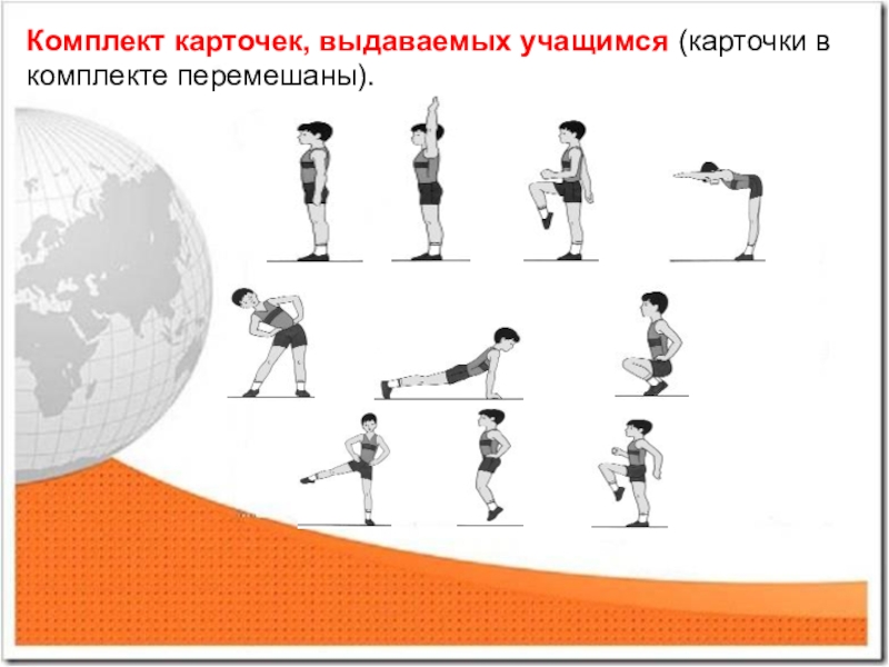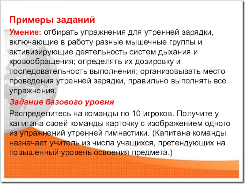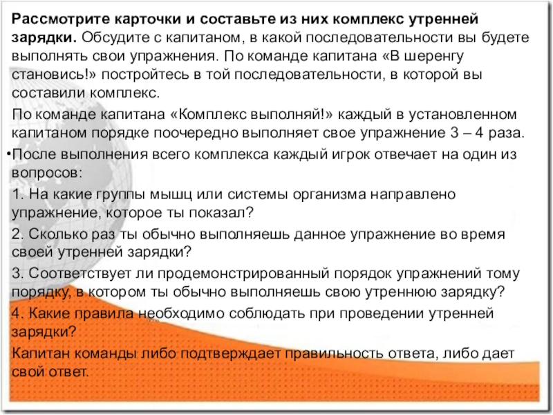 Распределитесь на команды по 10 игроков. Получите у капитана своей команды карточку с изображением одного из упражнений утренней гимнастики. (Капитана команды назначает учитель из числа учащихся, претендующих на повышенный уровень освоения предмета.)