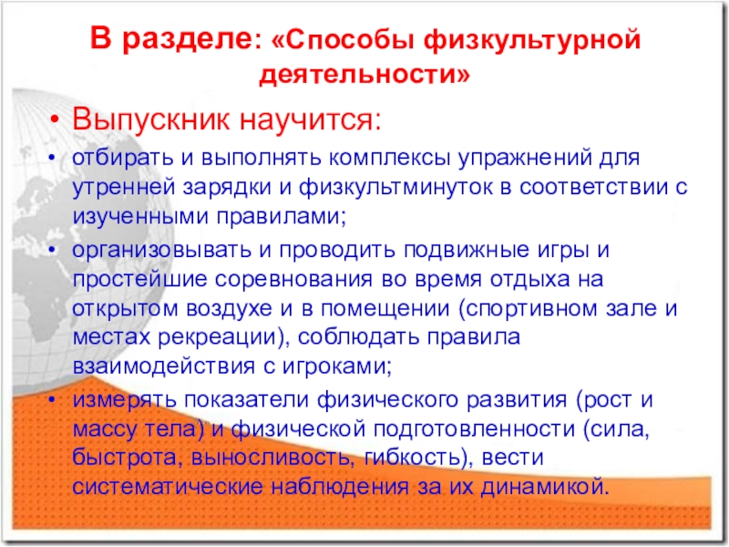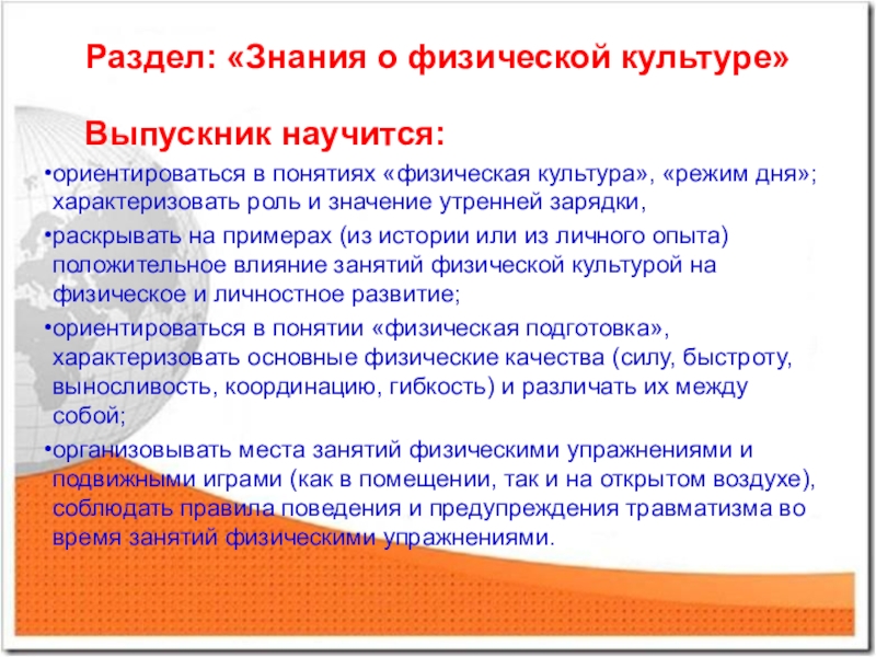 отбирать упражнения для утренней зарядки, включающие в работу разные мышечные группы и активизирующие деятельность систем дыхания и кровообращения; определять их дозировку и последовательность выполнения; организовывать место проведения утренней зарядки, правильно выполнять все упражнения;