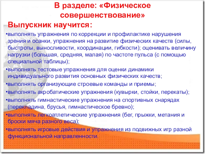 зрения и осанки, упражнения на развитие физических качеств (силы, быстроты, выносливости, координации, гибкости); оценивать величину нагрузки (большая, средняя, малая) по частоте пульса (с помощью специальной таблицы);
