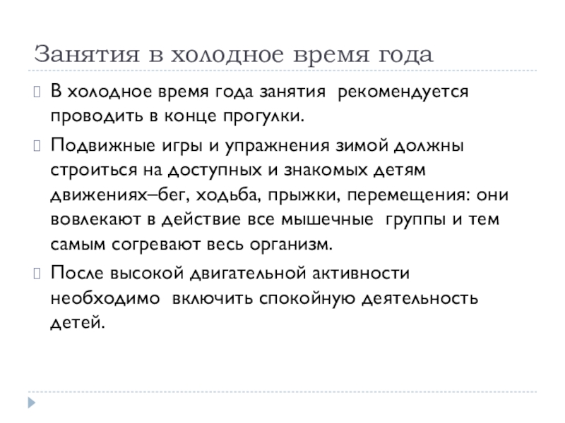 Занятия в холодное время годаВ холодное время года занятия рекомендуется проводить в конце прогулки.Подвижные игры и упражнения