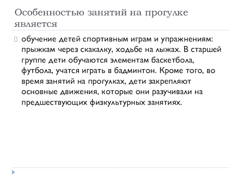 Особенностью занятий на прогулке являетсяобучение детей спортивным играм и упражнениям: прыжкам через скакалку, ходьбе на лыжах. В