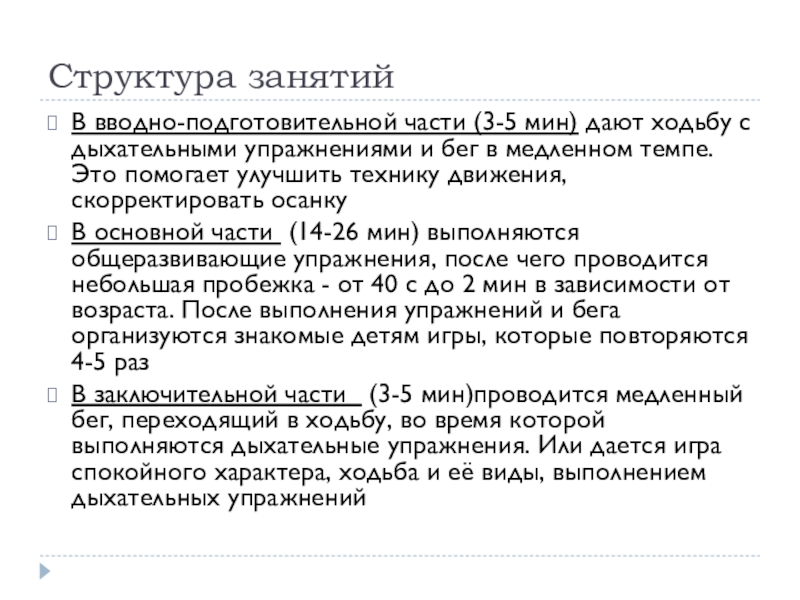Структура занятийВ вводно-подготовительной части (3-5 мин) дают ходьбу с дыхательными упражнениями и бег в медленном темпе. Это