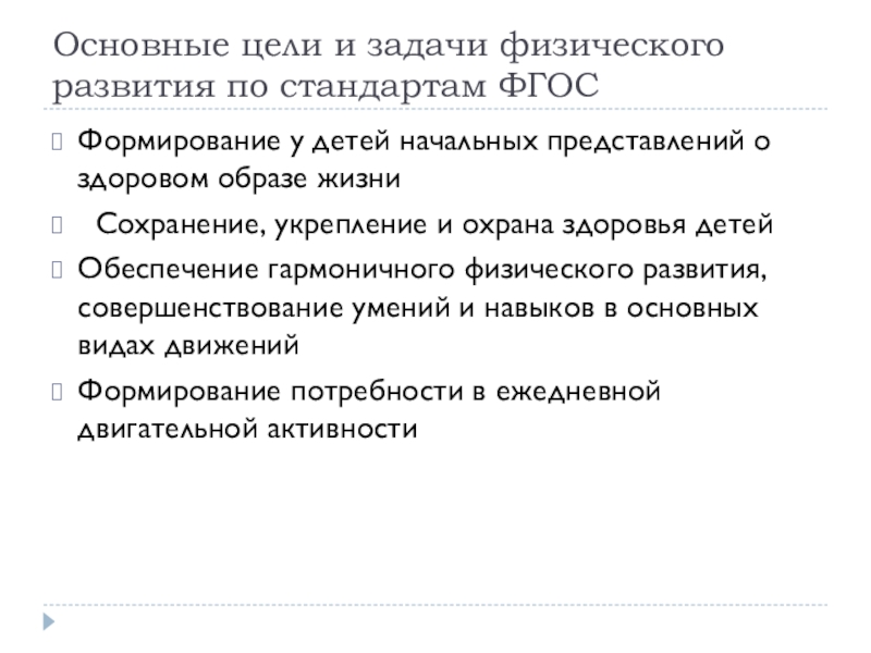 Основные цели и задачи физического развития по стандартам ФГОСФормирование у детей начальных представлений о здоровом образе жизни
