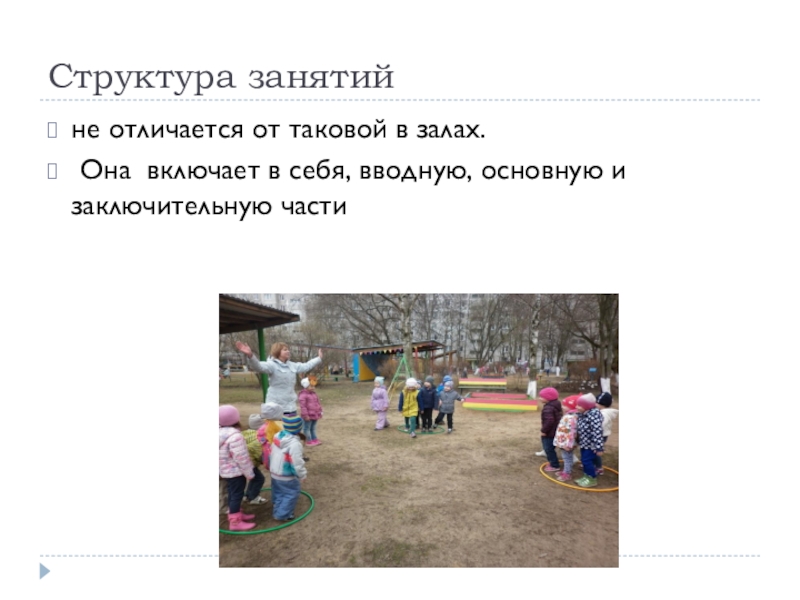 Структура занятийне отличается от таковой в залах. Она включает в себя, вводную, основную и заключительную части
