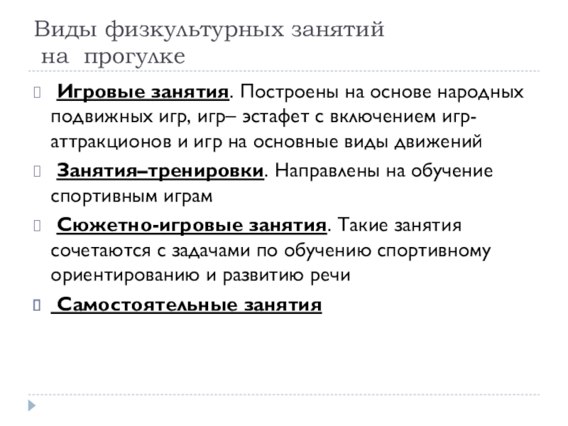 Слайд 9Виды физкультурных занятий на прогулке