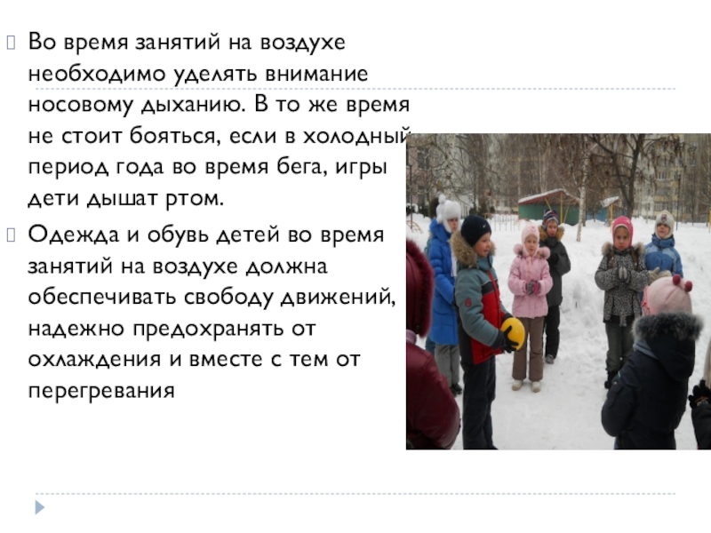 Одежда и обувь детей во время занятий на воздухе должна обеспечивать свободу движений, надежно предохранять от охлаждения и вместе с тем от перегревания