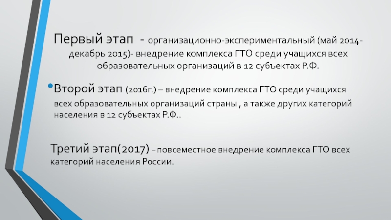 Третий этап(2017) – повсеместное внедрение комплекса ГТО всех категорий населения России.