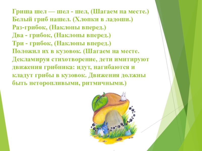 Гриша шел — шел - шел, (Шагаем на месте.) Белый гриб нашел. (Хлопки в ладоши.) Раз-грибок, (Наклоны вперед.) Два - грибок, (Наклоны вперед.) Три - грибок, (Наклоны вперед.) Положил их в кузовок. (Шагаем на месте. Декламируя