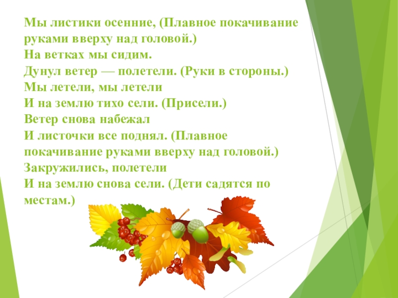 сидим. Дунул ветер — полетели. (Руки в стороны.) Мы летели, мы летели И на землю тихо сели. (Присели.) Ветер снова набежал И листочки все поднял. (Плавное покачивание руками вверху над головой.) Закружились, полетели И на землю снова сели. (Дети садятся по местам.)