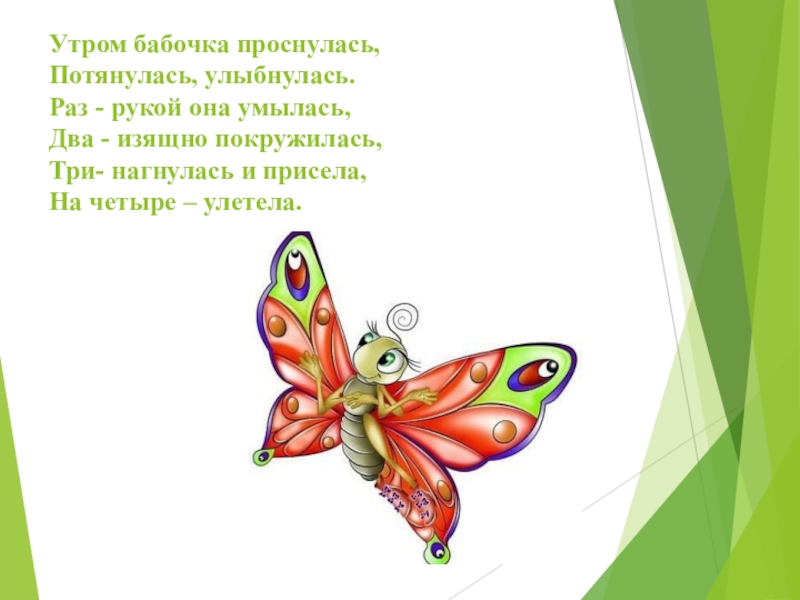 Слайд 6Утром бабочка проснулась, Потянулась, улыбнулась. Раз - рукой она умылась, Два - изящно покружилась, Три-