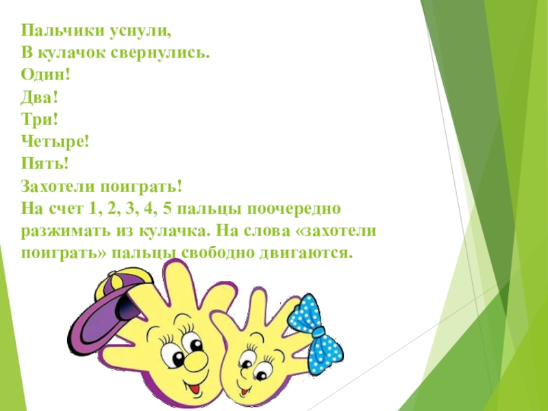 Пальчики уснули, В кулачок свернулись. Один! Два! Три! Четыре! Пять! Захотели поиграть! На счет 1, 2, 3,