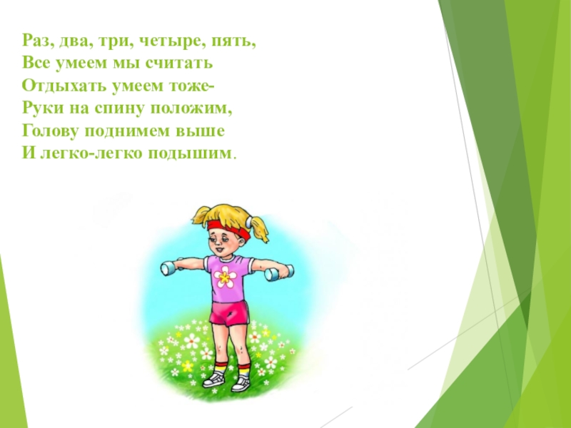 Слайд 7Раз, два, три, четыре, пять, Все умеем мы считать Отдыхать умеем тоже- Руки на