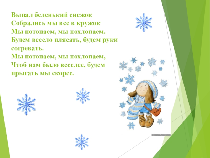 Слайд 5Выпал беленький снежок Собрались мы все в кружок Мы потопаем, мы похлопаем. Будем весело