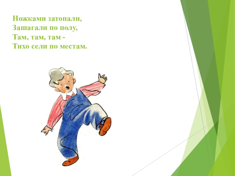 Слайд 4Ножками затопали, Зашагали по полу, Там, там, там - Тихо сели по местам.