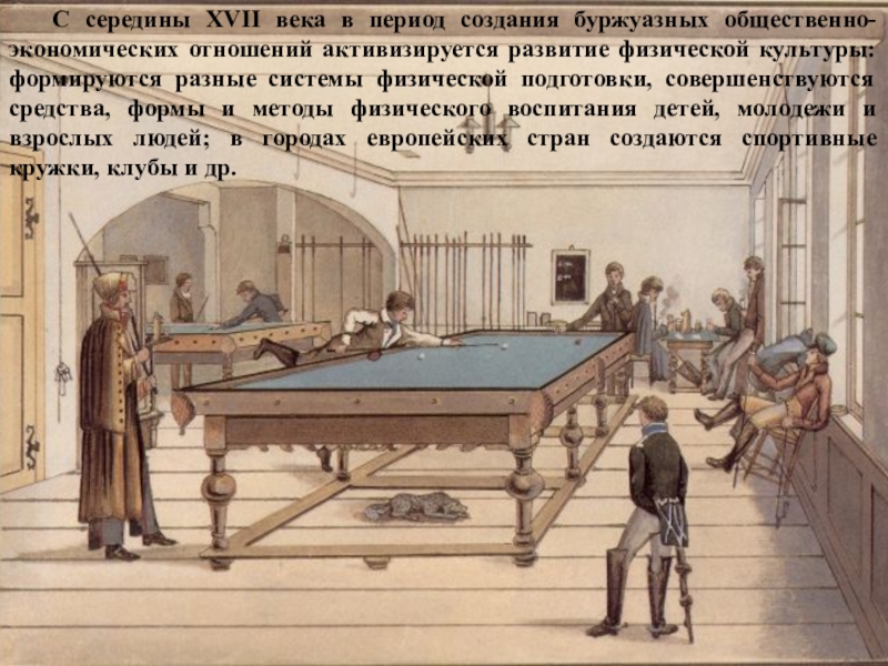 развитие физической культуры: формируются разные системы физической подготовки, совершенствуются средства, формы и методы физического воспитания детей, молодежи и взрослых людей; в городах европейских стран создаются спортивные кружки, клубы и др.