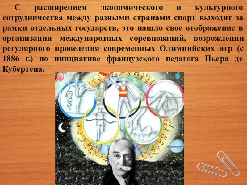 за рамки отдельных государств, это нашло свое отображение в организации международных соревнований, возрождении регулярного проведения современных Олимпийских игр (с 1886 г.) по инициативе французского педагога Пьера де Кубертена.