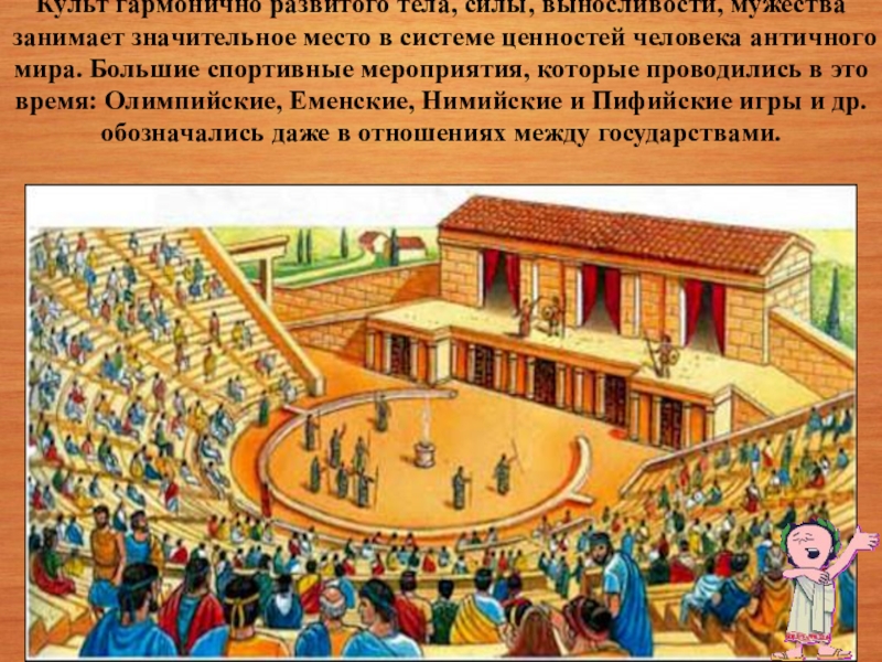 системе ценностей человека античного мира. Большие спортивные мероприятия, которые проводились в это время: Олимпийские, Еменские, Нимийские и Пифийские игры и др. обозначались даже в отношениях между государствами.
