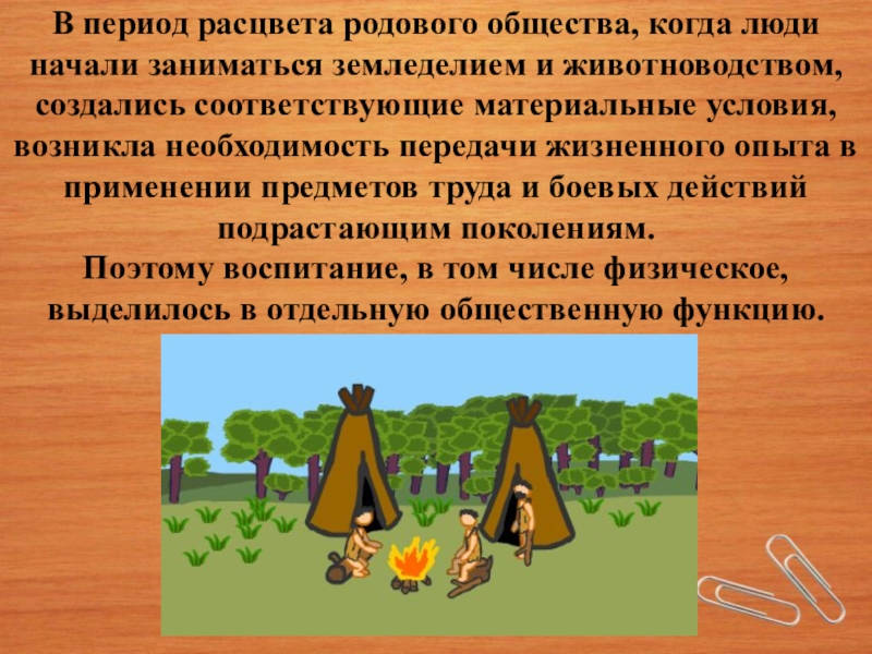 животноводством, создались соответствующие материальные условия, возникла необходимость передачи жизненного опыта в применении предметов труда и боевых действий подрастающим поколениям. Поэтому воспитание, в том числе физическое,