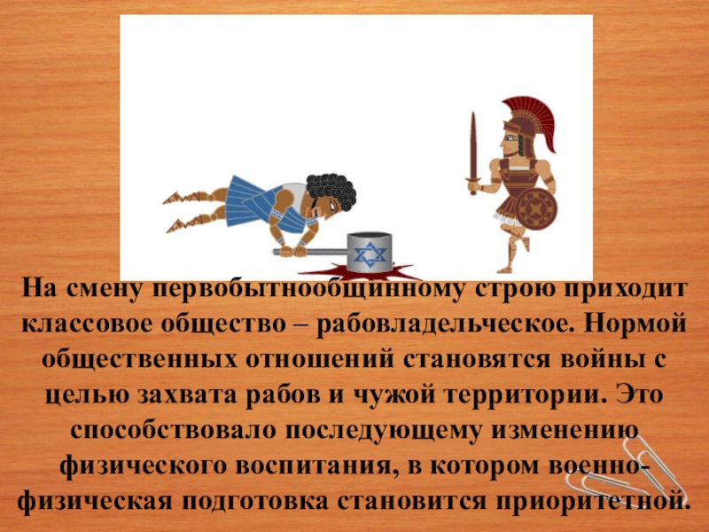 отношений становятся войны с целью захвата рабов и чужой территории. Это способствовало последующему изменению физического воспитания, в котором военно-физическая подготовка становится приоритетной.