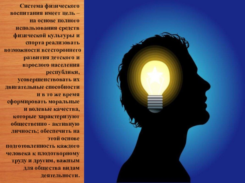 Слайд 12Система физического воспитания имеет цель – на основе полного использования средств