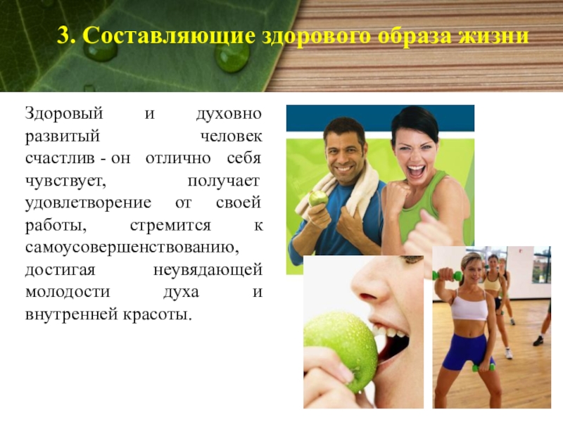 3. Составляющие здорового образа жизни Здоровый и духовно развитый человек счастлив - он отлично себя чувствует, получает удовлетворение от
