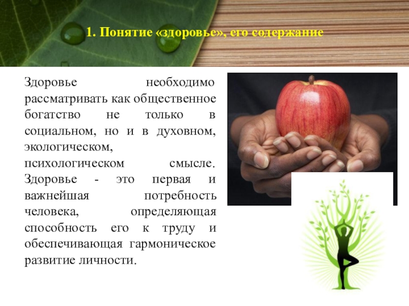 1. Понятие «здоровье», его содержание  Здоровье необходимо рассматривать как общественное богатство не только в социальном, но