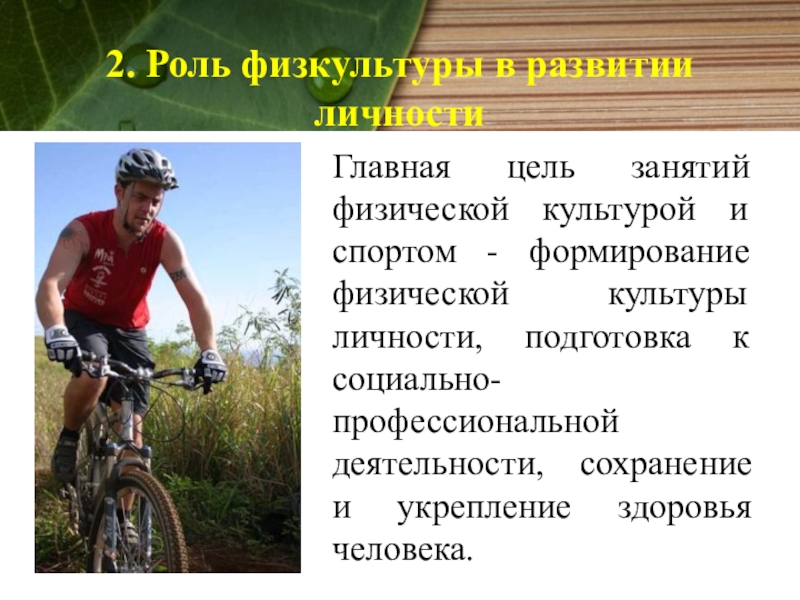 2. Роль физкультуры в развитии личности Главная цель занятий физической культурой и спортом - формирование физической культуры