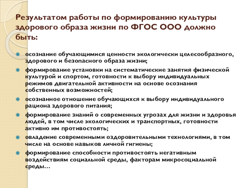 четко сформулированы цели и задачи деятельности учителя, ОУ по формированию ЗОЖ на разных ступенях обучения;