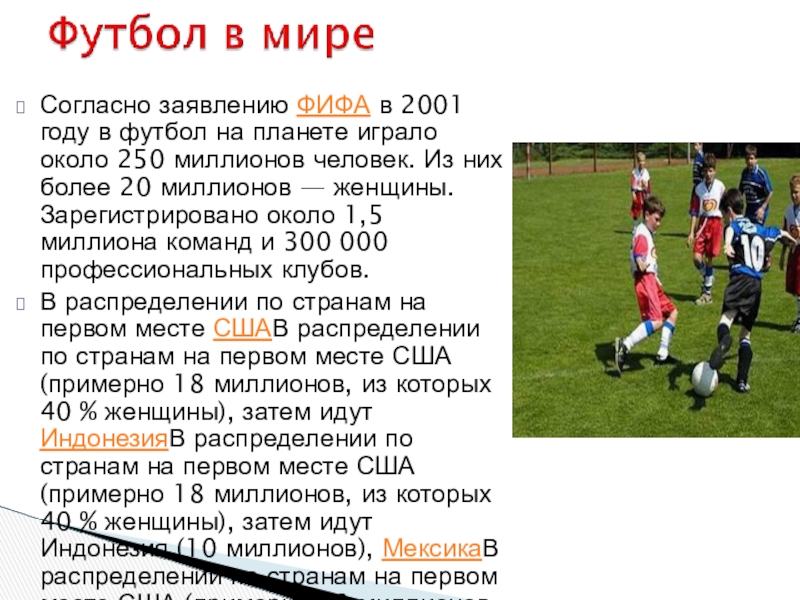 Слайд 6Согласно заявлению ФИФА в 2001 году в футбол на планете играло