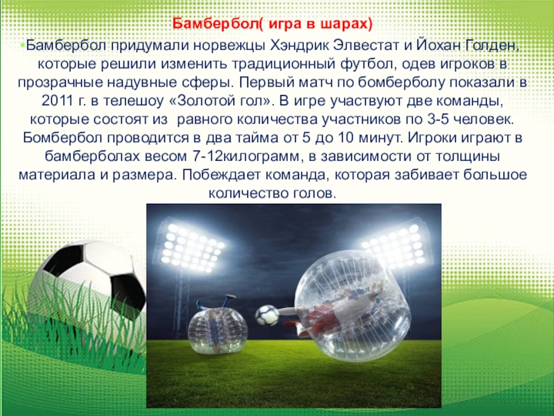 которые решили изменить традиционный футбол, одев игроков в прозрачные надувные сферы. Первый матч по бомберболу показали в 2011 г. в телешоу «Золотой гол». В игре участвуют две команды, которые состоят из равного количества участников по 3-5 человек. Бомбербол проводится в два тайма от 5 до 10 минут. Игроки играют в бамберболах весом 7-12килограмм, в зависимости от толщины материала и размера. Побеждает команда, которая забивает большое количество голов.