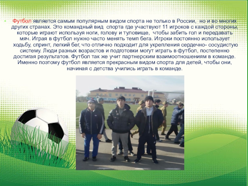 и во многих других странах. Это командный вид спорта где участвуют 11 игроков с каждой стороны, которые играют используя ноги, голову и туловище, чтобы забить гол и передавать мяч. Играя в футбол нужно часто менять темп бега. Игроки постоянно использует ходьбу, спринт, легкий бег, что отлично подходит для укрепления сердечно- сосудистую систему. Люди разных возрастов и подготовки могут играть в футбол, постепенно достигая результатов. Футбол так же учит партнерским взаимоотношениям в команде. Именно поэтому футбол является прекрасным видом спорта для детей, чтобы они, начиная с детства учились играть в команде.