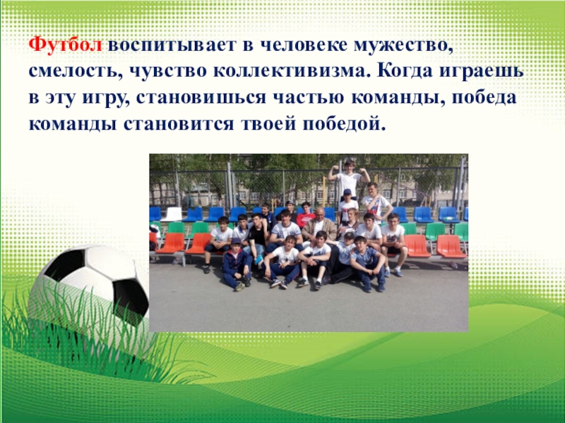 Слайд 17Футбол воспитывает в человеке мужество, смелость, чувство коллективизма. Когда играешь в