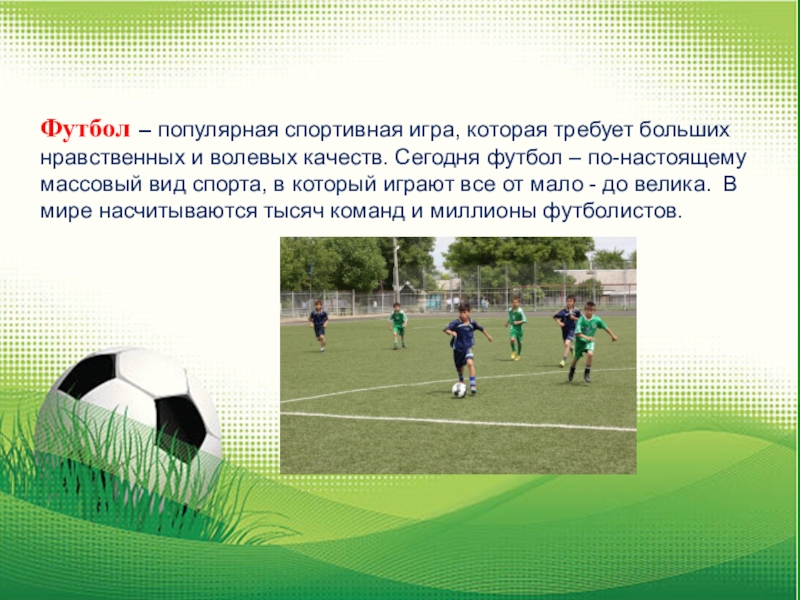 Слайд 4Футбол – популярная спортивная игра, которая требует больших нравственных и волевых