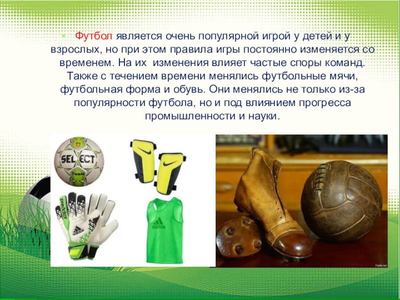 при этом правила игры постоянно изменяется со временем. На их изменения влияет частые споры команд. Также с течением времени менялись футбольные мячи, футбольная форма и обувь. Они менялись не только из-за популярности футбола, но и под влиянием прогресса промышленности и науки.