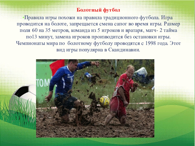 болоте, запрещается смена сапог во время игры. Размер поля 60 на 35 метров, команда из 5 игроков и вратаря, матч- 2 тайма по13 минут, замена игроков производится без остановки игры. Чемпионаты мира по болотному футболу проводятся с 1998 года. Этот вид игры популярна в Скандинавии.