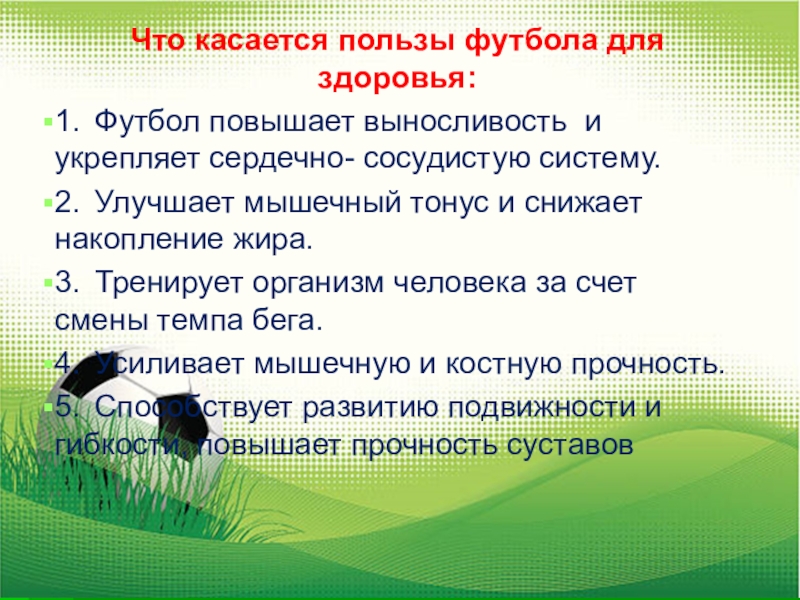 Слайд 13Что касается пользы футбола для здоровья: