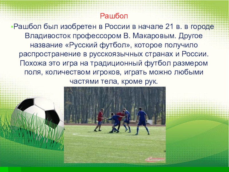 Владивосток профессором В. Макаровым. Другое название «Русский футбол», которое получило распространение в русскоязычных странах и России. Похожа это игра на традиционный футбол размером поля, количеством игроков, играть можно любыми частями тела, кроме рук.