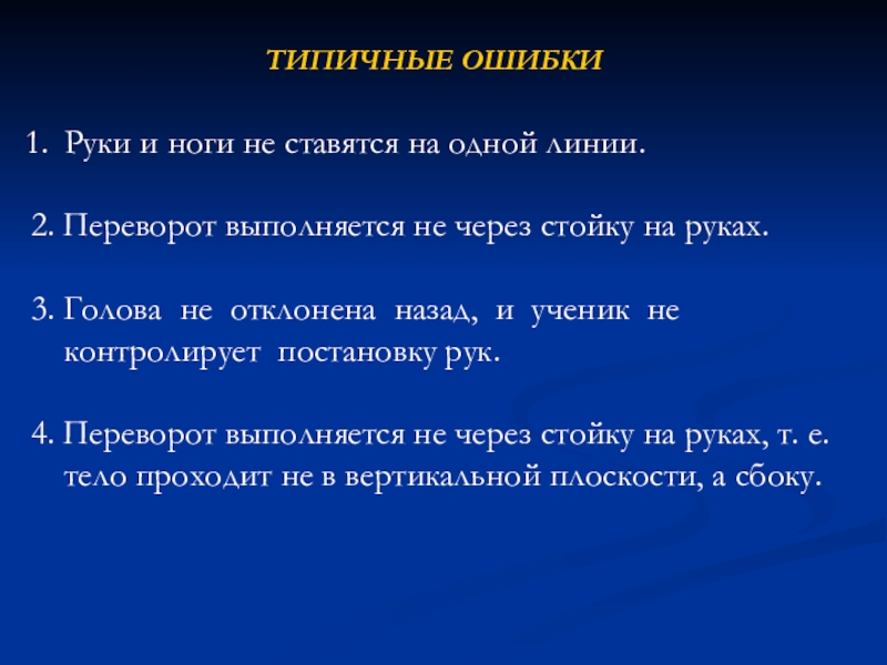 4. Переворот выполняется не через стойку на руках, т. е. тело проходит не в вертикальной плоскости, а сбоку.