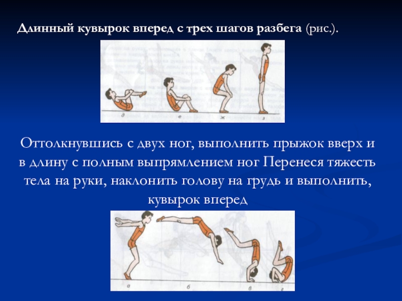 Кувырок выполняется аналогично кувырку прыжком с трех шагов разбега, но высота полетной фазы постепенно увеличивается, для чего и увеличивается длина и